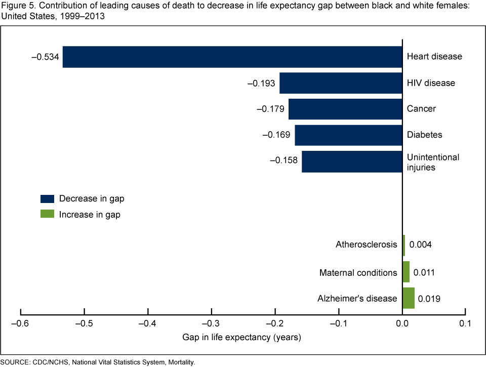 - The decrease in the gap in life expectancy between the black and white populations was due to larger decreases in death rates for the black population for heart disease, cancer, HIV disease, unintentional injuries, and perinatal conditions (Figure 3), which together accounted for 59.1% of the 2.3-year decrease in the gap.