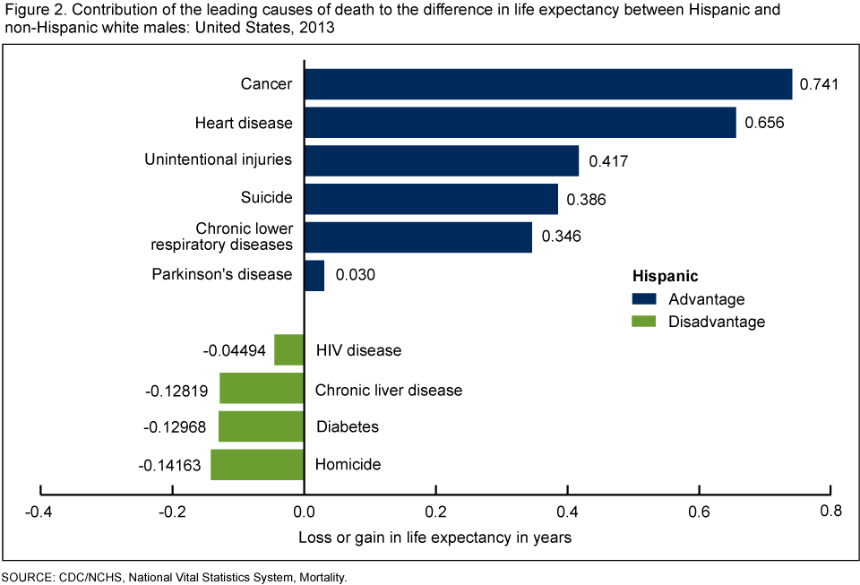 - Life expectancy at birth for Hispanic males was higher by 2.6 years than that of non-Hispanic white males because of lower death rates due to cancer, heart disease, unintentional injuries, suicide, chronic lower respiratory diseases, and Parkinson’s disease (Figure 2). Lower death rates for these causes accounted for 83% of the Hispanic male advantage.