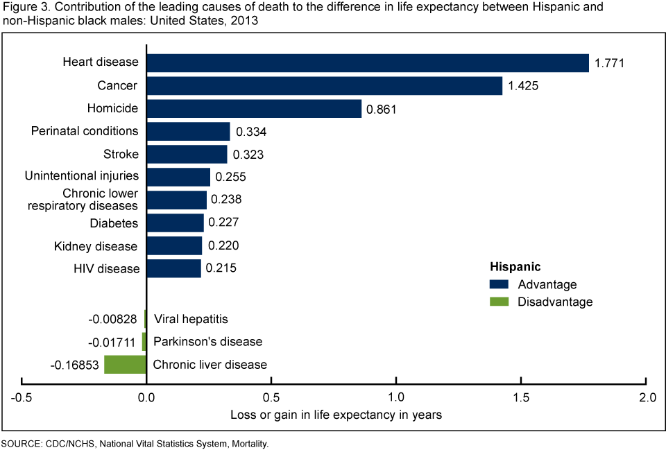 - Lower death rates for Hispanic males due to heart disease, cancer, homicide, perinatal conditions, stroke, unintentional injuries, chronic lower respiratory diseases, diabetes, kidney disease, and HIV disease (Figure 3) accounted for 78.9% of the Hispanic male advantage.