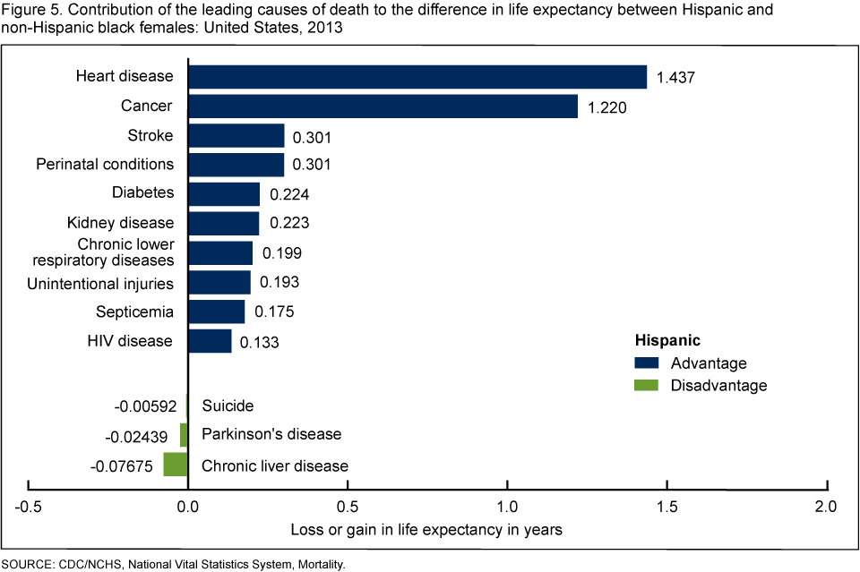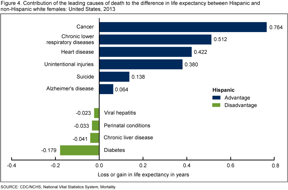 - Higher death rates for Hispanic females due to diabetes, chronic liver disease, perinatal conditions, and viral hepatitis accounted for 81.2% of the Hispanic female disadvantage, or a loss of life expectancy of 0.275 years.