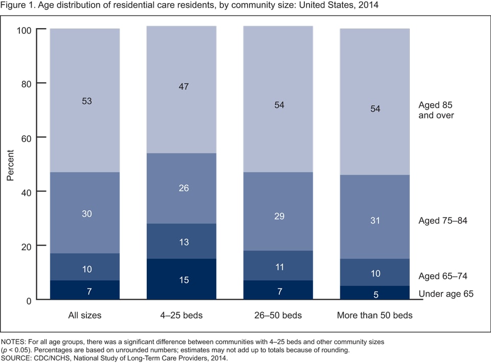 - In 2014, 15% of residents living in residential care communities with 4–25 beds were under age 65, compared with 5% in communities with more than 50 beds.