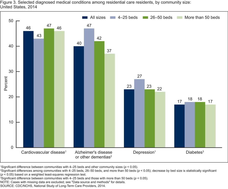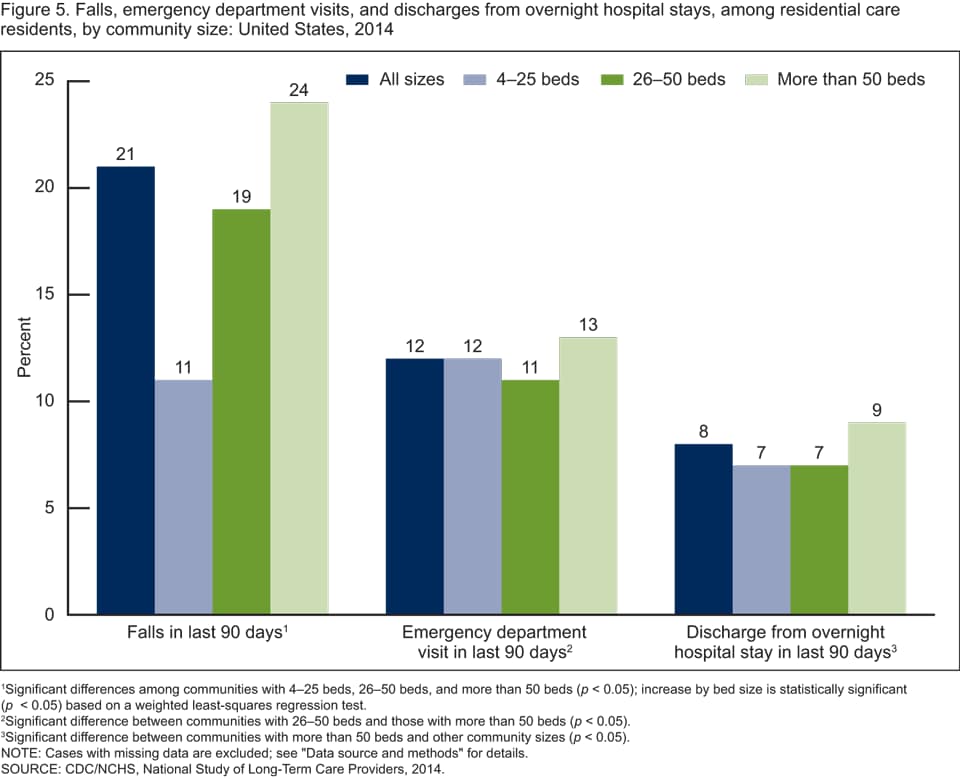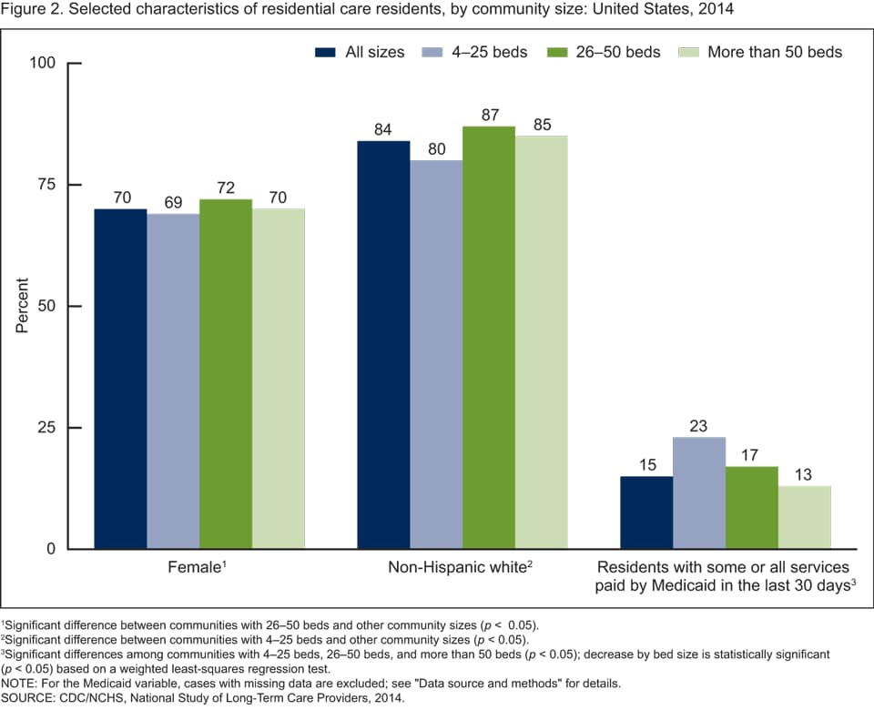 Sengupta M, Harris-Kojetin LD, Caffrey C. Variation in residential care community resident characteristics, by size of community: United States, 2014. NCHS data brief, no 223. Hyattsville, MD: National Center for Health Statistics. 2015.