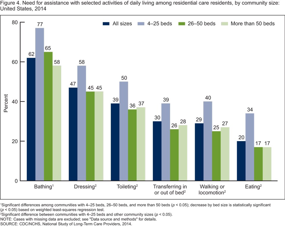 - The percentage of residents needing assistance in bathing, dressing, toileting, transferring, walking, and eating was highest in communities with 4–25 beds.