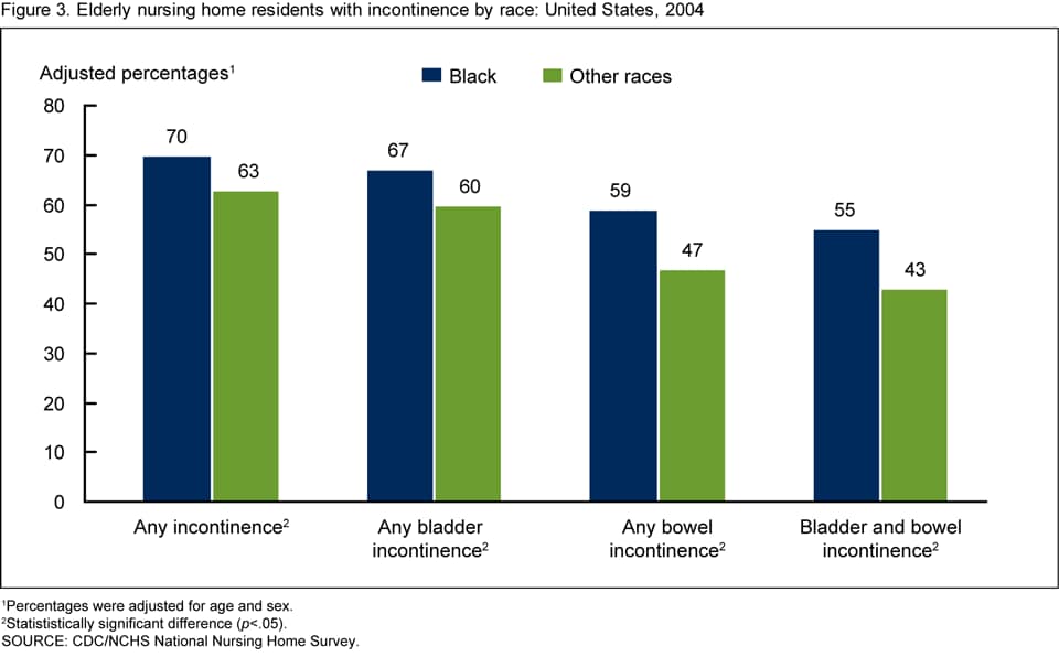 - Black nursing home residents were more likely to be incontinent of bladder, bowel, or both.