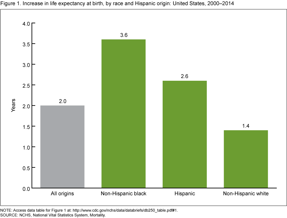 - Between 2000 and 2014, life expectancy increased by 3.6, 2.6, and 1.4 years, respectively, for non-Hispanic black, Hispanic, and non-Hispanic white persons.
