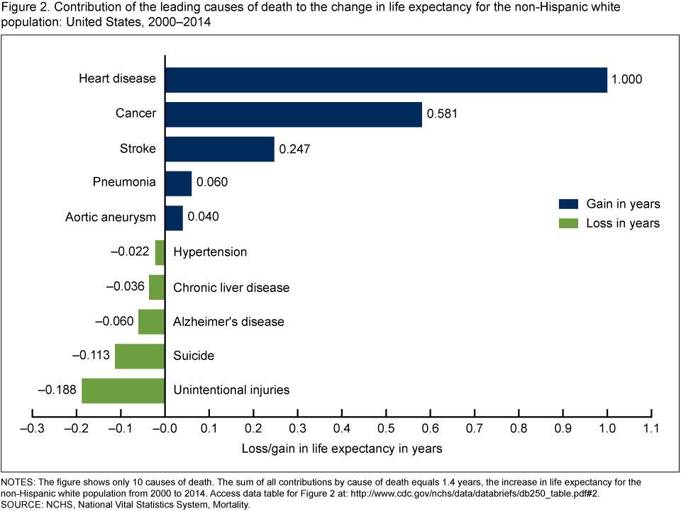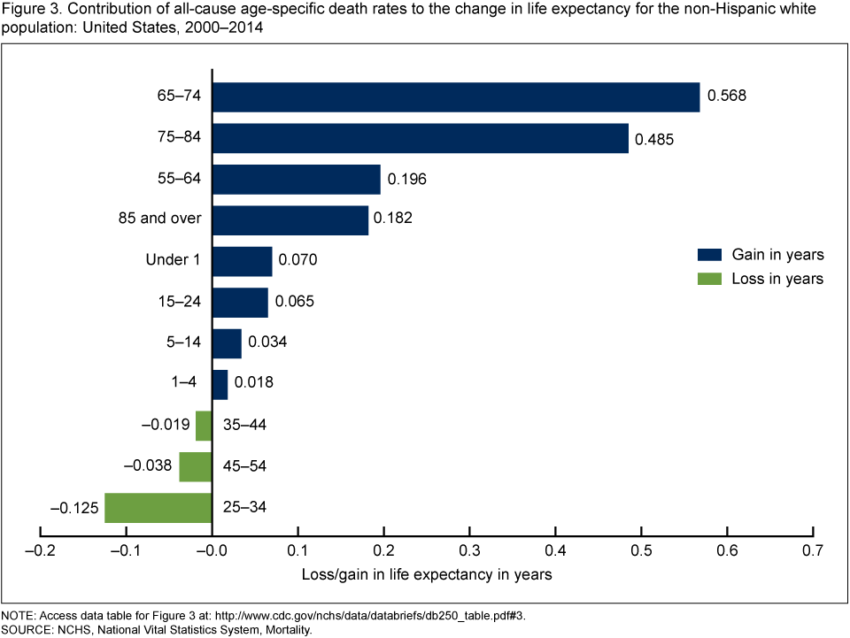 Kochanek KD, Arias E, Bastian BA. The effect of changes in selected age-specific causes of death on non-Hispanic white life expectancy between 2000 and 2014. NCHS data brief, no 250. Hyattsville, MD: National Center for Health Statistics. 2016.