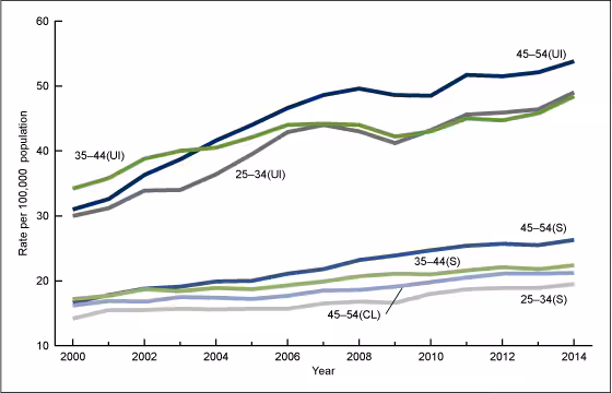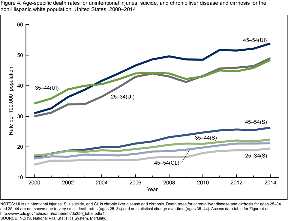 Death rates due to unintentional injuries, suicide, and chronic liver disease in ages 25–54 increased for the non-Hispanic white population from 2000 to 2014.