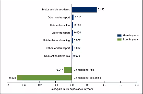 - Unintentional injuries, suicide, and chronic liver disease contributed a loss of 0.337 years in life expectancy.