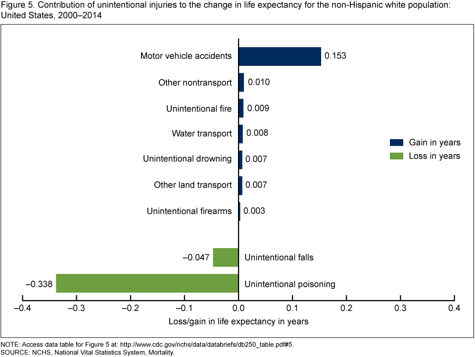 - Unintentional poisonings (mostly drug and alcohol poisoning) had the greatest contribution to the change in life expectancy for the non-Hispanic white population with a loss of 0.338 years.