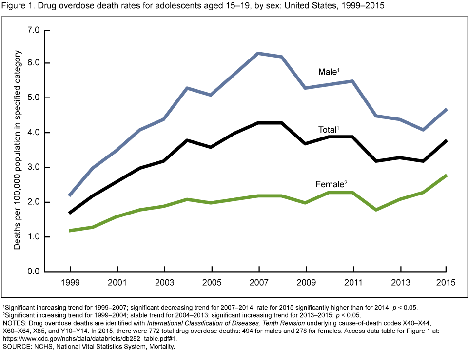Drug overdose deaths in the United States are a major public health challenge (1–3). The drug overdose death rate for adolescents aged 15–19 increased between 1999 and 2007, but unlike other age groups (1), the rate declined through 2014 before increasing in 2015. During the 1999–2015 period, drug overdose death rates for males aged 15–19 were consistently higher than for females. Both male and female adolescents experienced increases between 1999 and the mid-2000s but only males subsequently experienced a decline between 2007 and 2014. The rate for males increased between 2014 and 2015, although it was still below the 2007 peak. The majority of drug overdose deaths for both sexes in 2015 were unintentional, although female deaths were more than twice as likely as male deaths to be suicides. Overdose death rates among those aged 15–19 were highest for opioid drugs, specifically heroin.