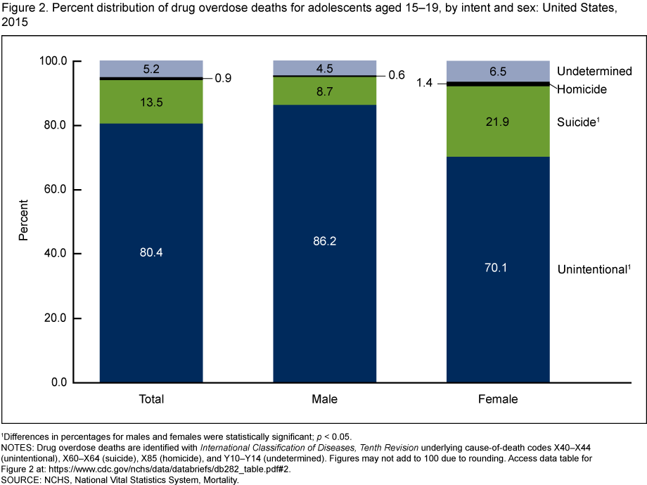 - A higher percentage of male (86.2%) than female (70.1%) overdose deaths in adolescents aged 15–19 were unintentional.