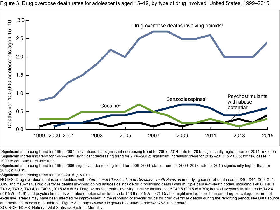 - Rates of drug overdose deaths involving opioids among adolescents aged 15–19 tripled from 1999 to 2007, generally declined from 2007 to 2014, and then increased in 2015.