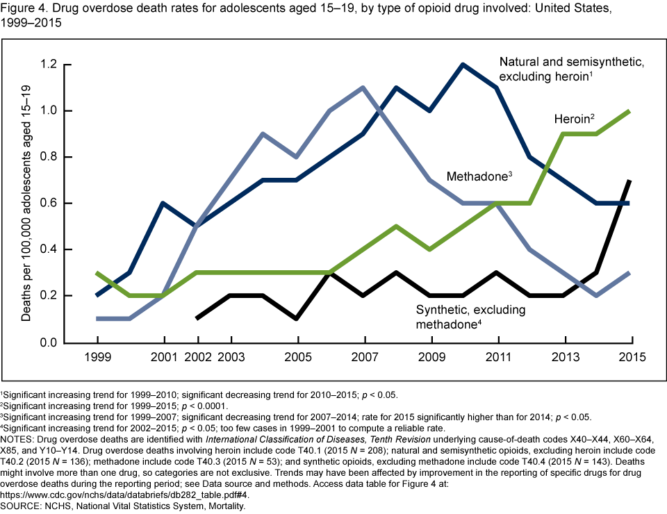 - The rate of drug overdose deaths involving heroin among adolescents aged 15–19 increased during the 1999–2015 period and was three times higher in 2015 (1.0 per 100,000) than in 1999 (0.3) (Figure 4).