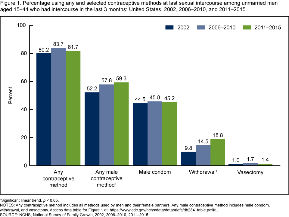 In 2011–2015, among unmarried men aged 15–44 who had sexual intercourse in the last 3 months, 81.7% used a method of contraception at last intercourse. Nearly 60% reported using a male method of contraception at last intercourse (condom, withdrawal, or vasectomy). Male condoms were used by 45.2% of men at last intercourse, a percentage statistically unchanged from 2006–2010 (45.8%) and 2002 (44.5%). Use of withdrawal increased over these three time points, to 18.8% in 2011–2015.