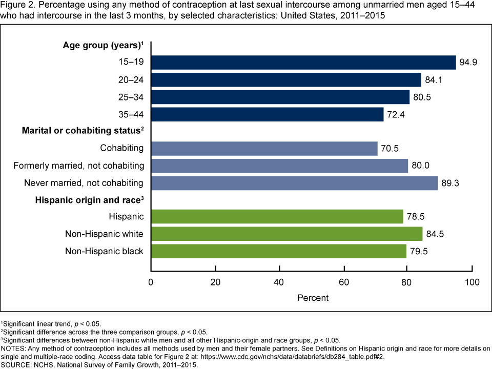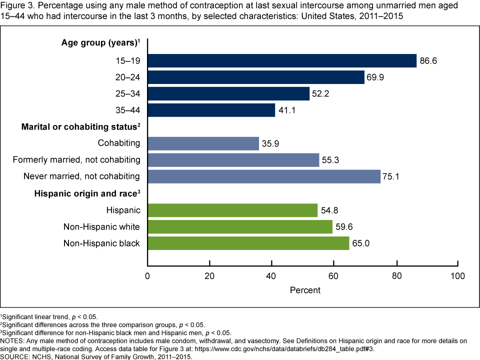 - In 2011–2015, 81.7% of unmarried men who had sexual intercourse in the last 3 months reported that they or their female partner used any method of contraception at last sexual intercourse.