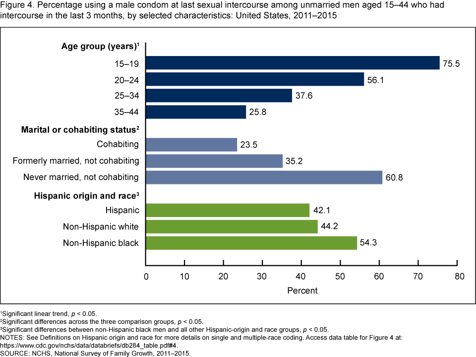 - A higher percentage of non-Hispanic black men used condoms at their last sexual intercourse (54.3%) compared with non-Hispanic white (44.2%) and Hispanic (42.1%) men.