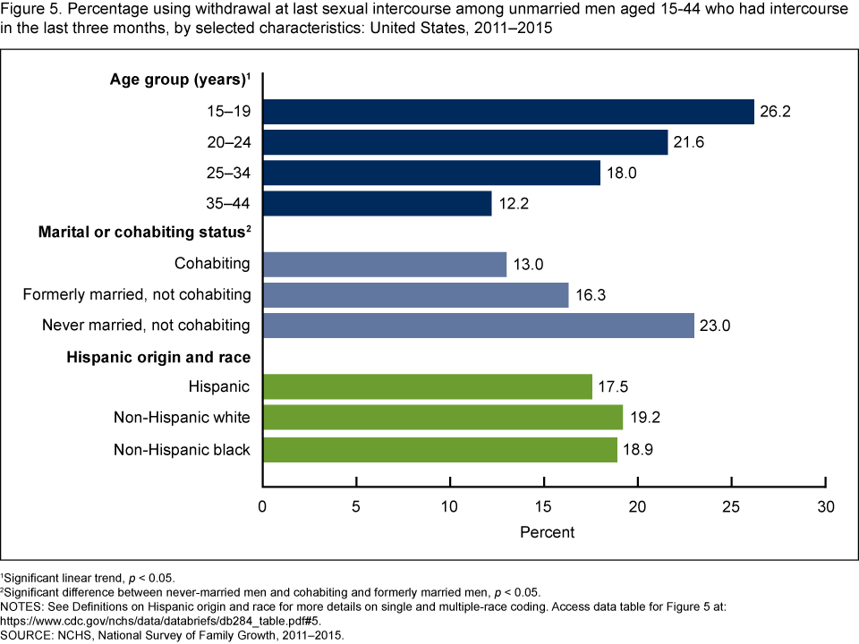 - Use of withdrawal varied by age and marital or cohabiting status, but no differences were seen by Hispanic origin and race.