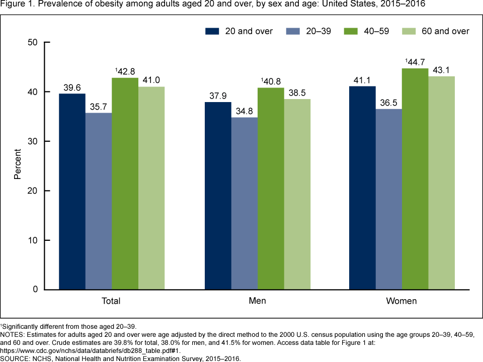 Hales CM, Carroll MD, Fryar CD, Ogden CL. Prevalence of obesity among adults and youth: United States, 2015–2016. NCHS data brief, no 288. Hyattsville, MD: National Center for Health Statistics. 2017.