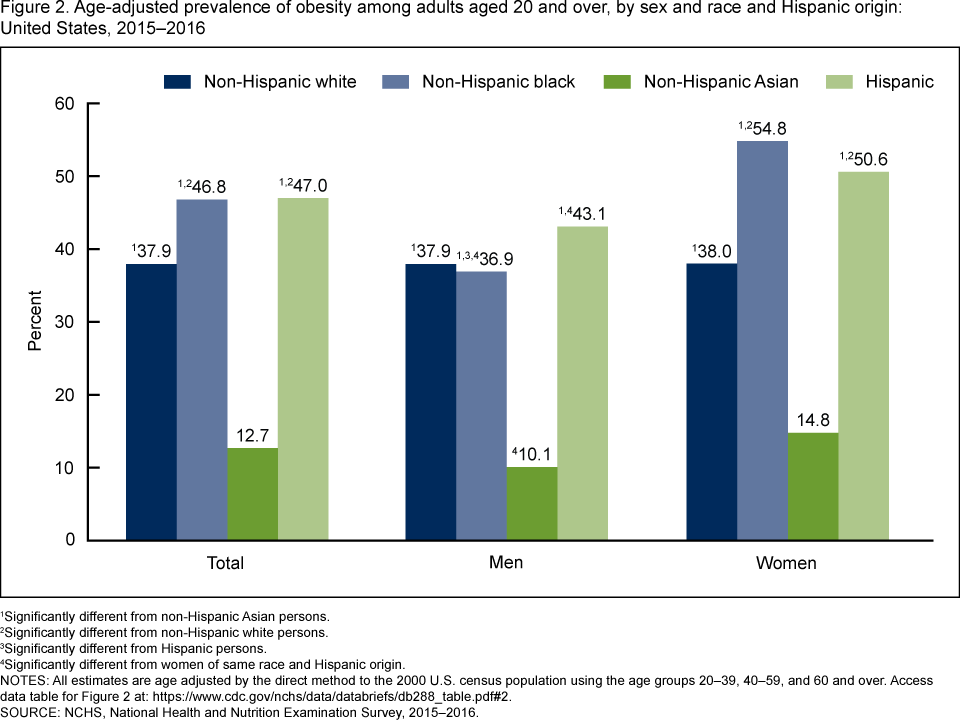 Figure 2. Age-adjusted prevalence of obesity among adults aged 20 and over, by sex and race and Hispanic origin: United States, 2015–2016