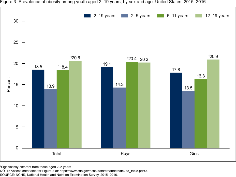 The prevalence of obesity among U.S. youth was 18.5% in 2015–2016. Overall, the prevalence of obesity among adolescents (12–19 years) (20.6%) and school-aged children (6–11 years) (18.4%) was higher than among preschool-aged children (2–5 years) (13.9%). School-aged boys (20.4%) had a higher prevalence of obesity than preschool-aged boys (14.3%). Adolescent girls (20.9%) had a higher prevalence of obesity than preschool-aged girls (13.5%) (Figure 3).