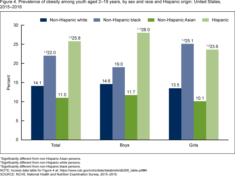 Figure 4. Prevalence of obesity among youth aged 2–19 years, by sex and race and Hispanic origin: United States, 2015–2016