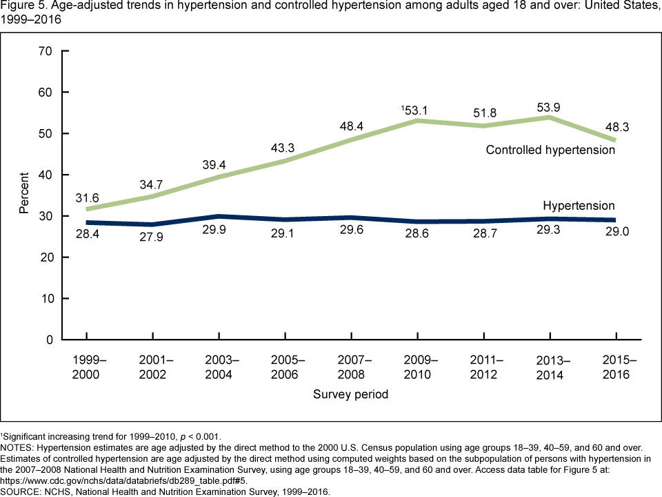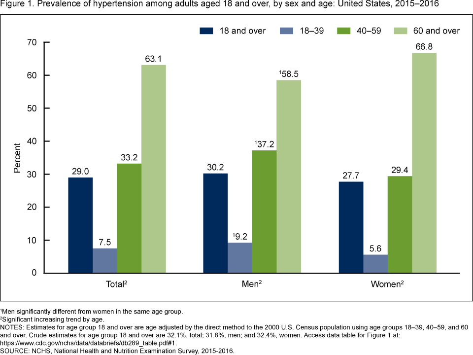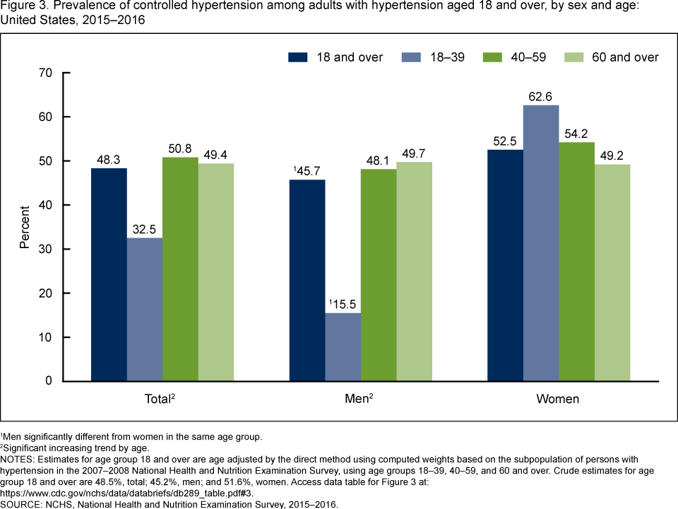 Fryar CD, Ostchega Y, Hales CM, Zhang G, Kruszon-Moran D. Hypertension prevalence and control among adults: United States, 2015–2016. NCHS data brief, no 289. Hyattsville, MD: National Center for Health Statistics. 2017.