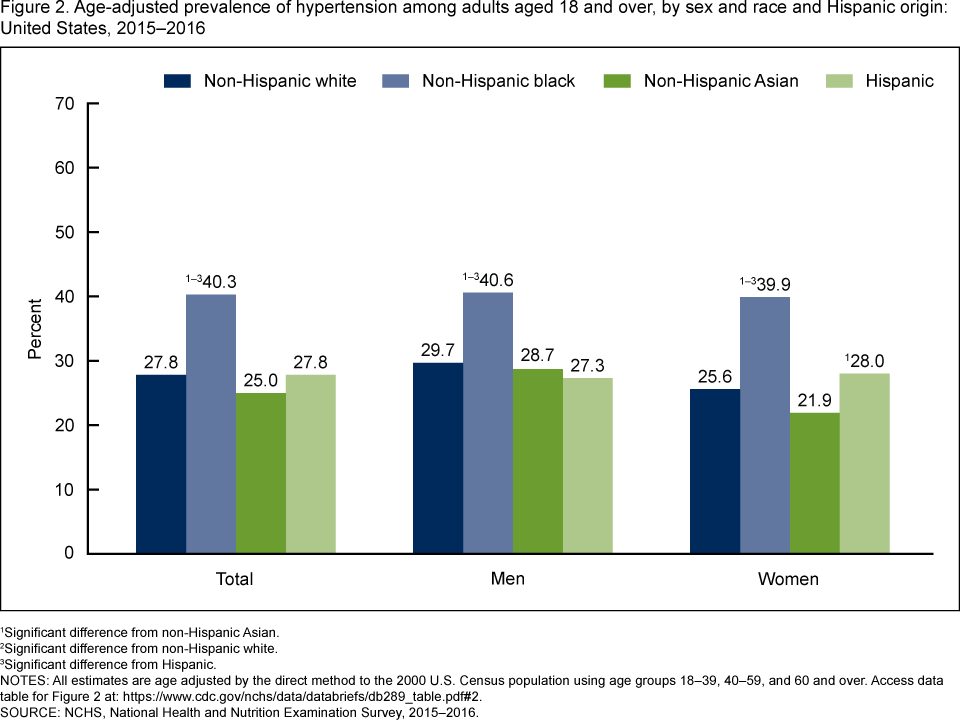 Figure 2. Age-adjusted prevalence of hypertension among adults aged 18 and over, by sex and race and Hispanic origin: United States, 2015–2016