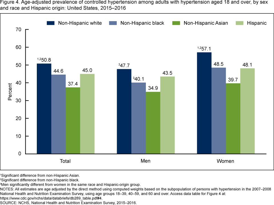 Figure 4. Age-adjusted prevalence of controlled hypertension among adults with hypertension aged 18 and over, by sex and race and Hispanic origin: United States, 2015–2016