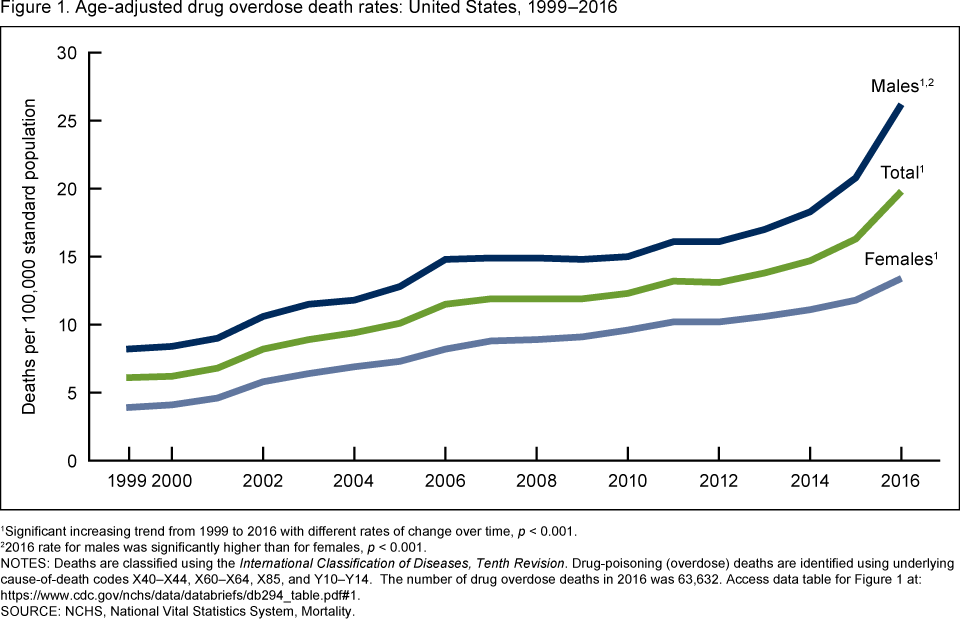- Rates were significantly higher for males than females. For males, the rate increased from 8.2 in 1999 to 26.2 in 2016. For females, the rate increased from 3.9 in 1999 to 13.4 in 2016.