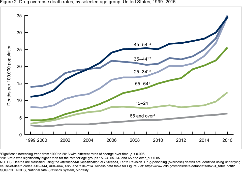 Figure 2. Drug overdose death rates, by selected age group: United States, 1999–2016