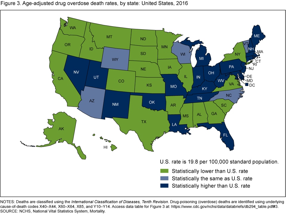 - In 2016, 22 states and the District of Columbia had age-adjusted drug overdose death rates that were statistically higher than the national rate.