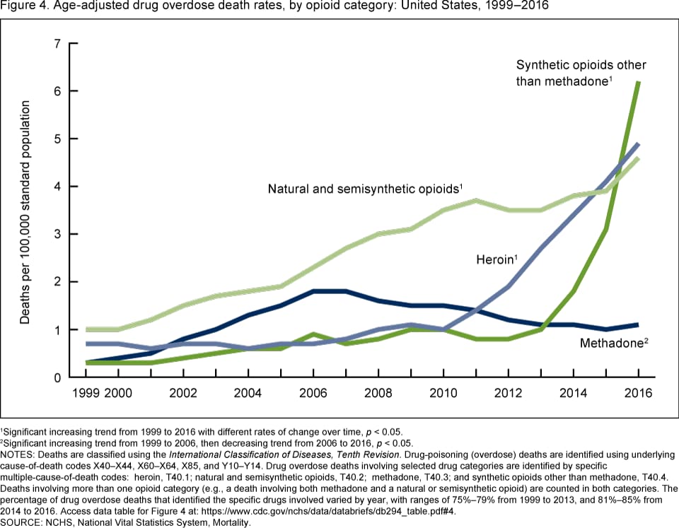 - The age-adjusted rate of drug overdose deaths involving synthetic opioids other than methadone doubled from 2015 to 2016.