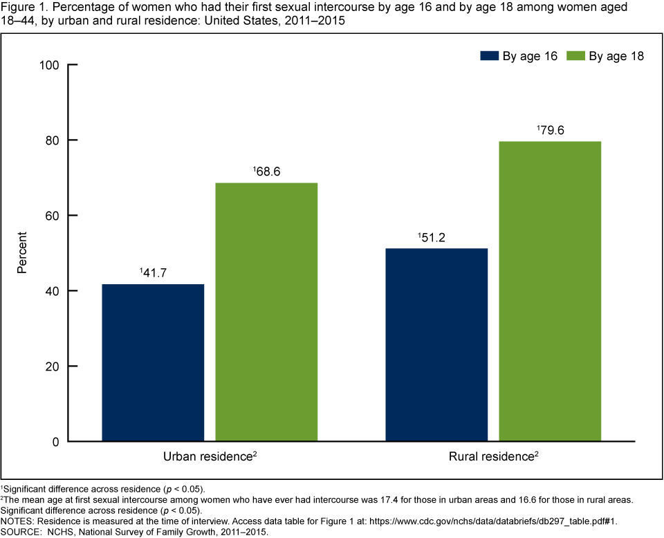 - Among women aged 18–44, the average age at first sexual intercourse was younger for women living in rural areas (16.6) compared with women living in urban areas (17.4).