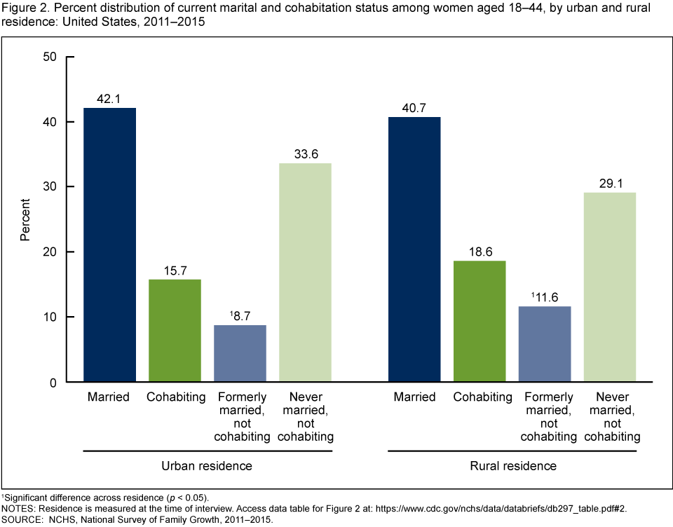 - The percentage of women currently cohabiting with an opposite-sex partner was similar for women in urban (15.7%) and rural (18.6%) areas.