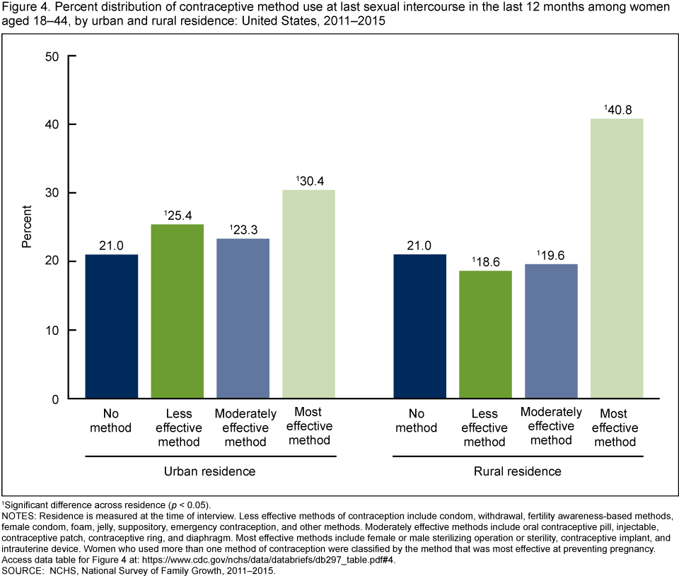- A higher percentage of women living in rural areas used one of the most effective methods of contraception (e.g., contraceptive sterilization or intrauterine device) at last sexual intercourse in the past year compared with women in urban areas.