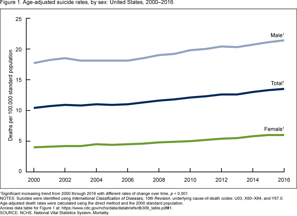 - From 2000 through 2016, suicide rates increased for both males and females, with greater annual percentage increases occurring after 2006.