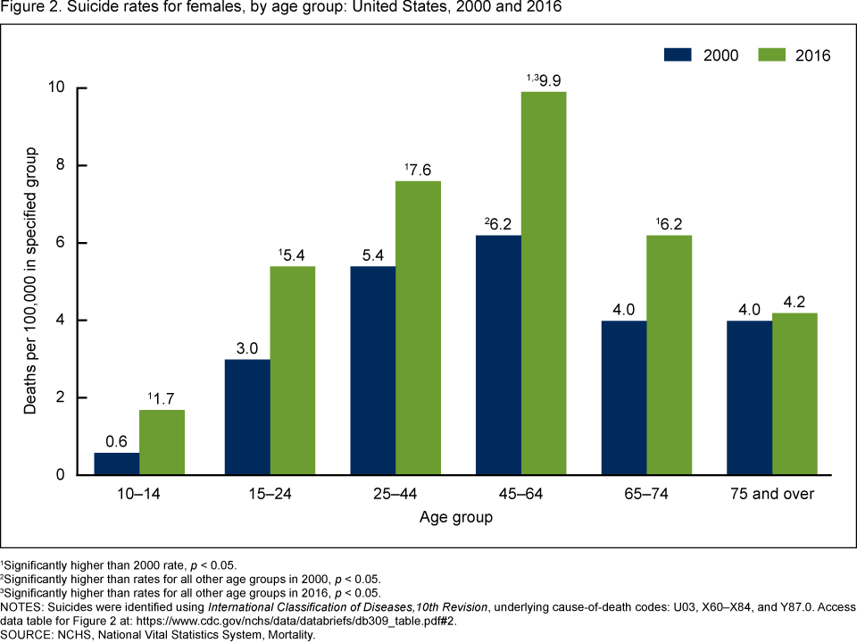 - Suicide rates were significantly higher in 2016 compared with 2000 among females aged 15–24 (5.4 and 3.0, respectively), 25–44 (7.6 and 5.4), 45–64 (9.9 and 6.2), and 65–74 (6.2 and 4.0).