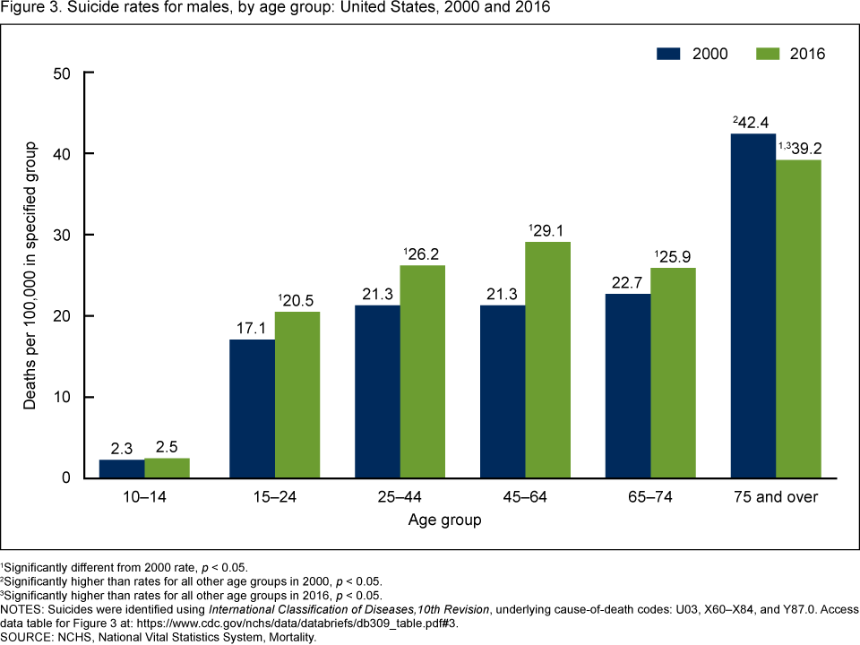 - Suicide rates were significantly higher in 2016 compared with 2000 among males aged 15–24 (20.5 and 17.1, respectively), 25–44 (26.2 and 21.3), 45–64 (29.1 and 21.3), and 65–74 (25.9 and 22.7).