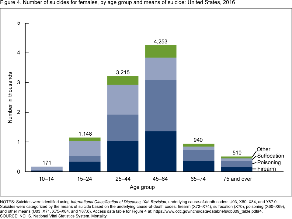 Figure 4. Number of suicides for females, by age group and means of suicide: United States, 2016
