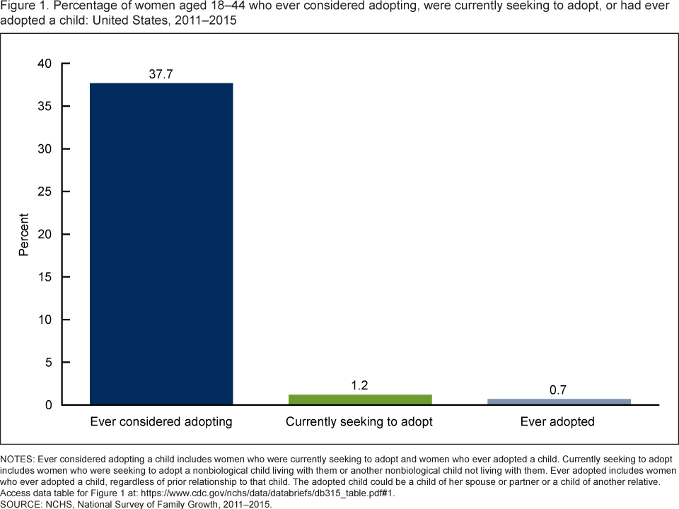 - Among women aged 18–44 in 2011–2015, 37.7% had ever considered adopting a child (Figure 1).