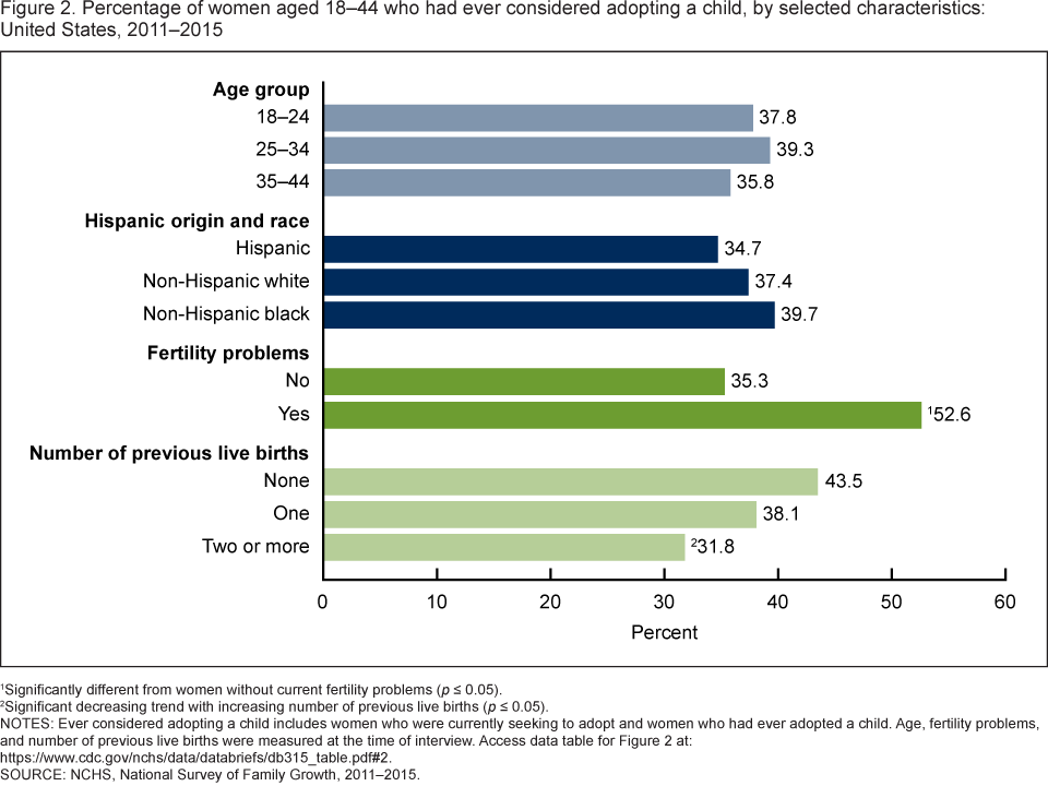 The adoption-related behaviors described in this report varied by selected background characteristics such as age, Hispanic origin and race, current fertility problems, and number of births. In 2011–2015, nearly 38% of women aged 18–44 had ever considered adopting a child. Compared with women without fertility problems, women with current fertility problems were more likely to have ever considered adopting, which is consistent with previous findings that women with infertility or impaired fecundity and those who have used infertility services are more likely to have considered adoption than those without fertility problems and who did not use fertility services (5). This report shows that women aged 25–34 and 35–44 and women with current fertility problems were more likely than women aged