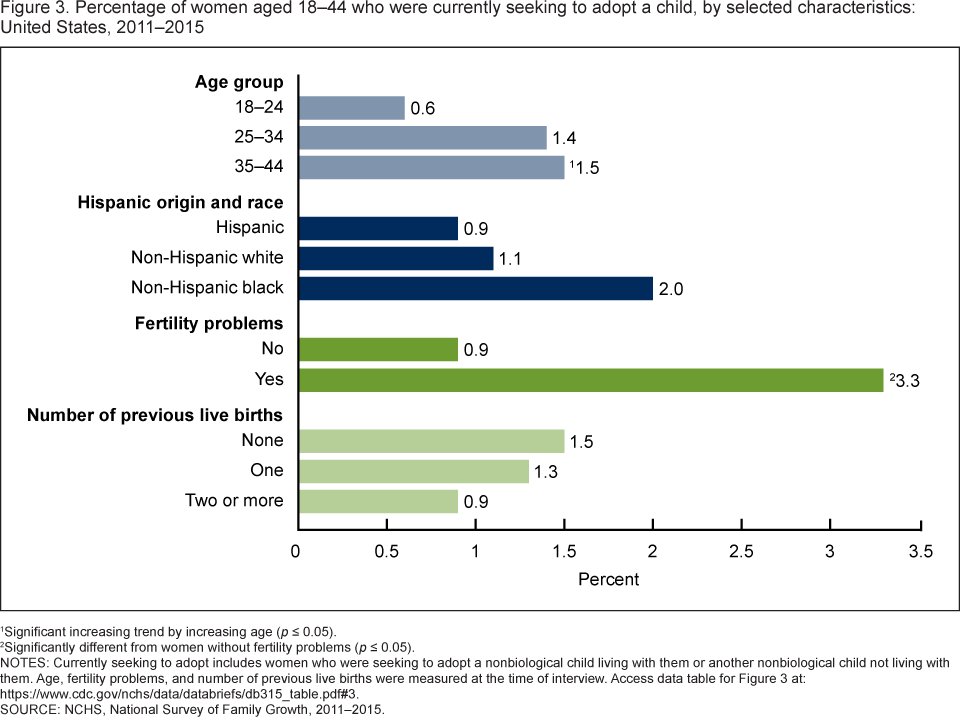 - Among women aged 18–44, those with current fertility problems (3.3%) were approximately four times as likely to be currently seeking to adopt a child as women without current fertility problems (0.9%).
