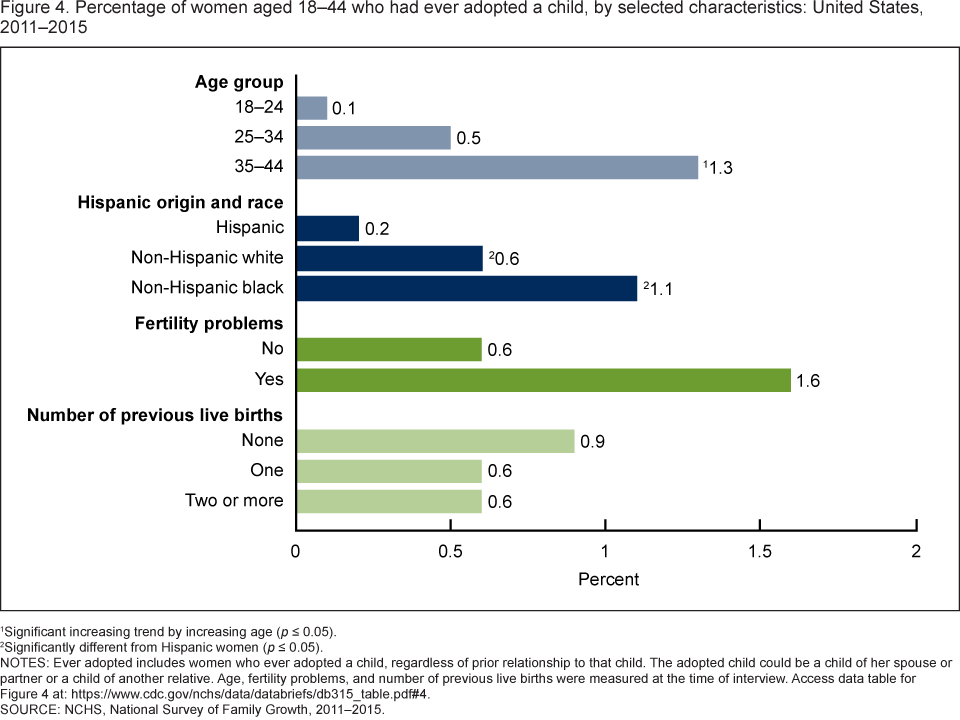 - Compared with Hispanic women (0.2%), higher percentages of non-Hispanic white women (0.6%) and non-Hispanic black women (1.1%) aged 18–44 had ever adopted.