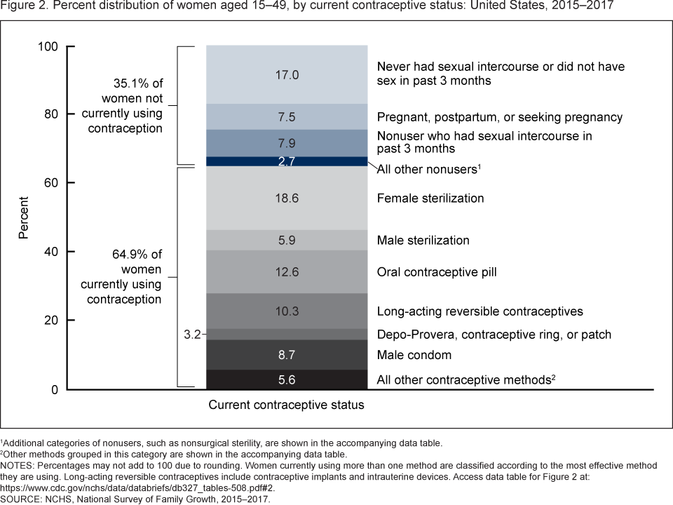 Daniels K, Abma JC. Current contraceptive status among women aged 15–49: United States, 2015–2017. NCHS Data Brief, no 327. Hyattsville, MD: National Center for Health Statistics. 2018.