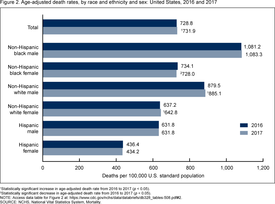 The age-adjusted death rate for the total population increased 0.4% from 728.8 per 100,000 standard population in 2016 to 731.9 in 2017 (Figure 2). Age-adjusted death rates increased in 2017 from 2016 for non-Hispanic white males (0.6%) and non-Hispanic white females (0.9%). The age-adjusted death rate decreased for non-Hispanic black females (0.8%). Rates did not change significantly for non-Hispanic black males, Hispanic males, and Hispanic females from 2016 to 2017.