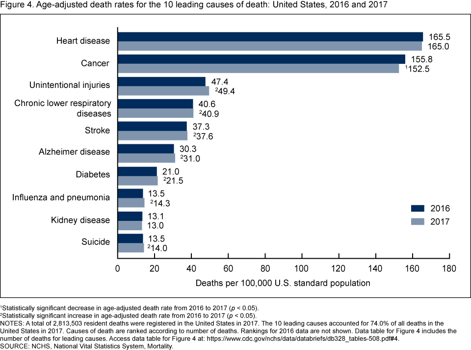 In 2017, the 10 leading causes of death (heart disease, cancer, unintentional injuries, chronic lower respiratory diseases, stroke, Alzheimer disease, diabetes, influenza and pneumonia, kidney disease, and suicide) remained the same as in 2016. Causes of death are ranked according to number of deaths (1). The 10 leading causes accounted for 74.0% of all deaths in the United States in 2017.