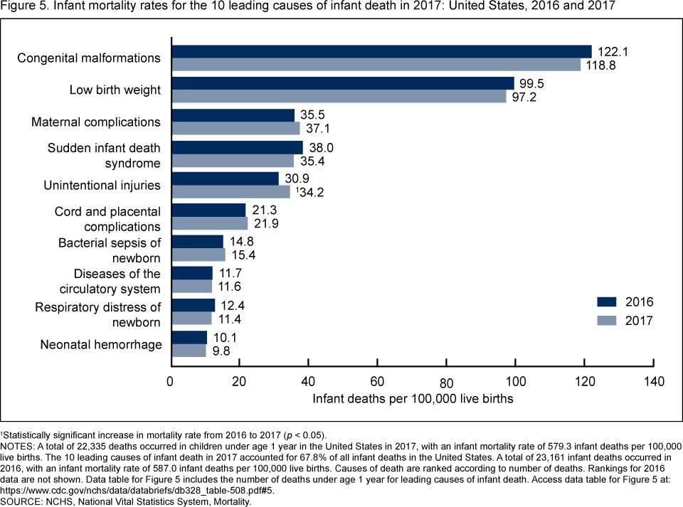 NOTE: A total of 22,335 deaths occurred in children under age 1 year in the United States in 2017, with an infant mortality rate of 579.3 infant deaths per 100,000 live births. The 10 leading causes of infant death in 2017 accounted for 67.8% of all infant deaths in the United States. A total of 23,161 infant deaths occurred in 2016, with an infant mortality rate of 587.0 infant deaths per 100,000 live births. Causes of death are ranked according to number of deaths. Rankings for 2016 data are not shown. Data table for Figure 5 includes the number of deaths under age 1 year for leading causes of infant death. Access data table for Figure 5.