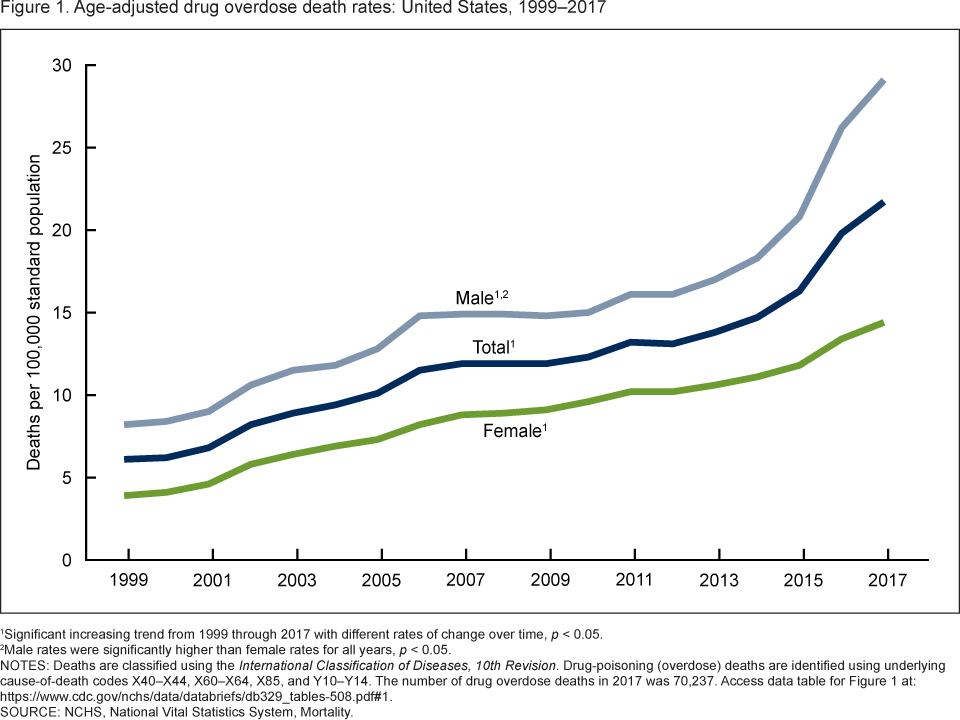 Hedegaard H, Miniño AM, Warner M. Drug overdose deaths in the United States, 1999–2017. NCHS Data Brief, no 329. Hyattsville, MD: National Center for Health Statistics. 2018.