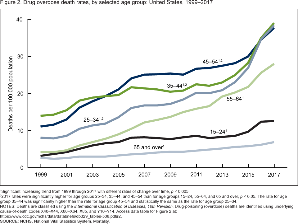 - From 1999 to 2017, the greatest percentage change in drug overdose death rates occurred among adults aged 55–64, increasing from 4.2 per 100,000 in 1999 to 28.0 in 2017, a more than 6-fold increase.