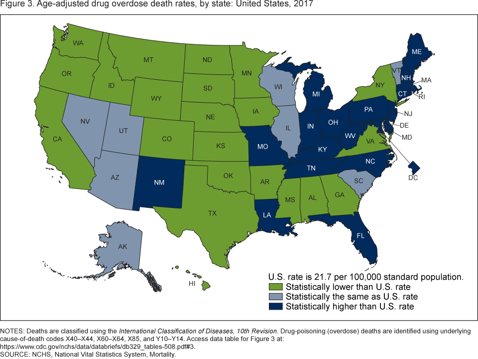 - In 2017, 20 states and the District of Columbia had age-adjusted drug overdose death rates that were statistically higher than the national rate.